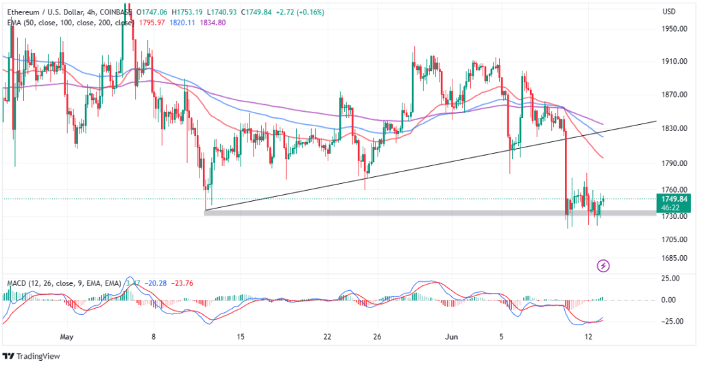 ETH is trading at $1,750 at the time of writing, with $1,730 as a strong support level. Aayush Jindal, an analyst at NewsBTC, believes that Ether needs only to regain support at $1,800 to validate a more significant recovery move to $2,000.