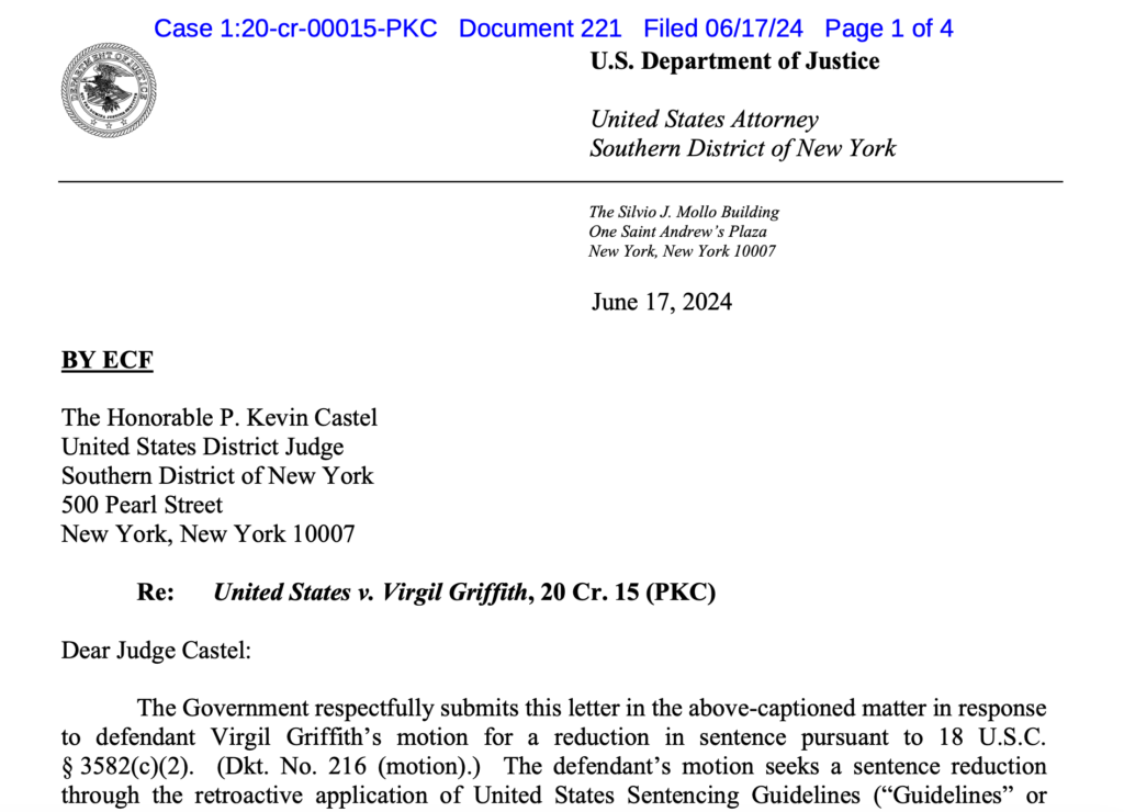 The United States Justice Department has issued a letter opposing the motion of former Ethereum developer Virgil Griffith to reduce his 2022 sentence for violating sanctions on North Korea.