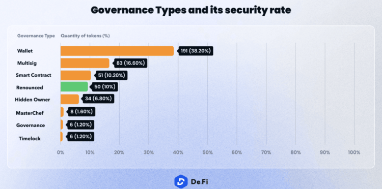 Nearly 75% of the 429 tokens with governance frameworks, according to an analysis by Web3 firm De.Fi, has contract-related risk factors, such as concealed owners and wallets with special permissions.