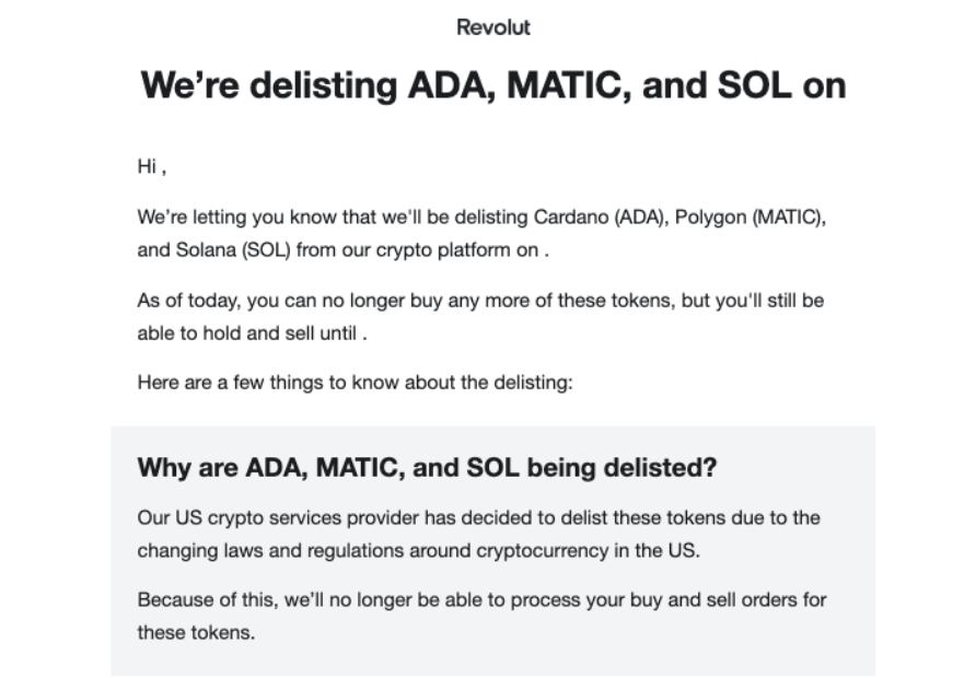 Revolut is one of many companies to delist these three tokens. In the past few weeks, Robinhood, eToro, and Bakkt have all announced the delisting of ADA, MATIC, and SOL, suspending all purchases.