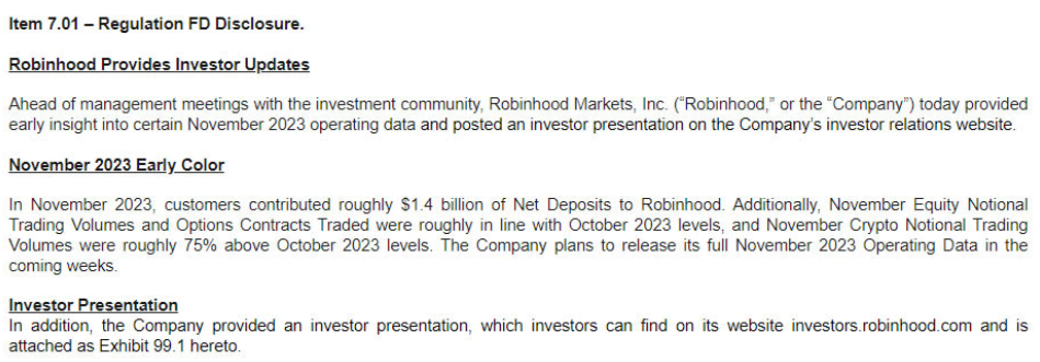 Robinhood disclosed on December 4 in a Form 8-K filing with the United States Securities and Exchange Commission (SEC) that “November Crypto Notional Trading Volumes were approximately 75% higher than October 2023 levels.”