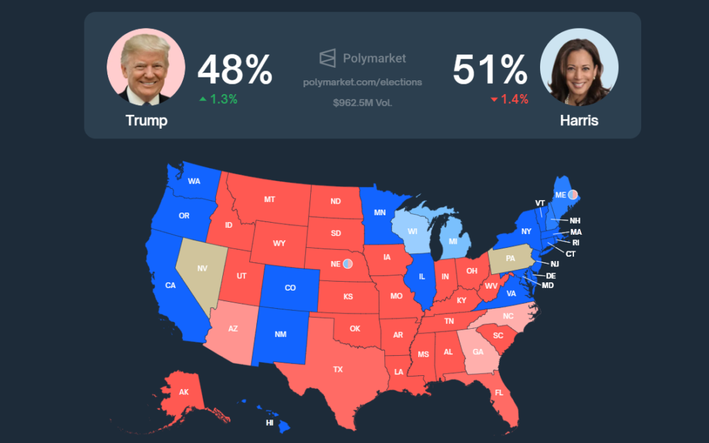 According to data provided by Polymarket, Harris is now in the lead over Trump in the midst of fierce competition between the two contenders. Following the recent campaign in swing states and polls, Harris has 51% odds of winning the election, while Trump has 48% odds of going to victory.