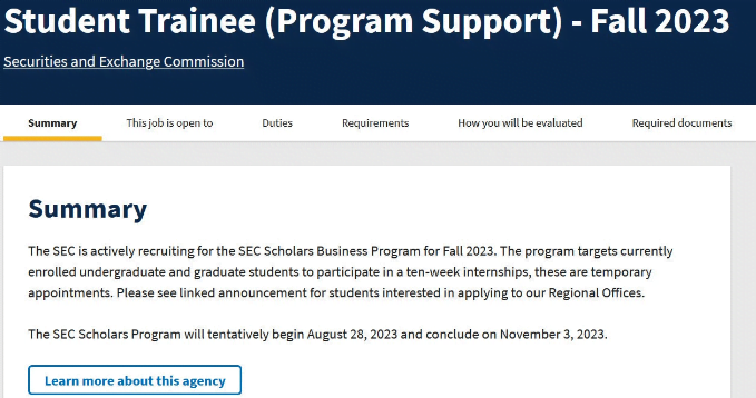 The United States Securities and Exchange Commission (SEC) is now accepting students seeking internships for its Scholars Program for Fall 2023 starting at $15.09 an hour.