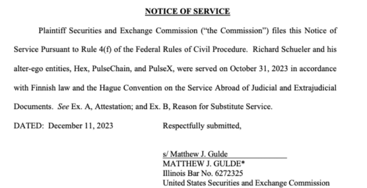 The United States Securities and Exchange Commission stated that it served HEX founder Richard Schueler, also known as Richard Heart, at his residence in Helsinki via an alternate method, the capital of Finland, on behalf of the commission.