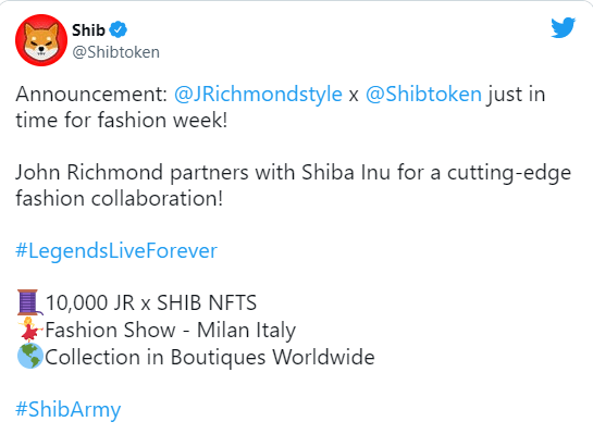 This is another tremendous alliance, according to Shiba Inu's main developer on the event, who tweeted that it will transform the fashion business forever. However, no other information about the partnership has been released.