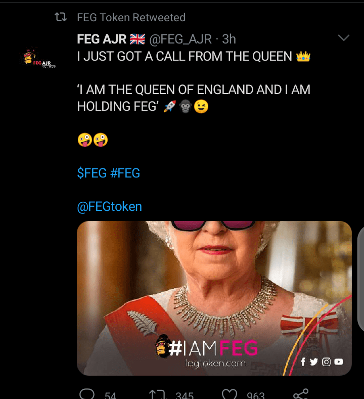 The future is bright for Feg as the Queen of England, Elizabeth II has revealed her support for the Gorrila coin. According to the official flag token Twitter handle, it reads, “I JUST GOT A CALL FROM THE QUEEN 👑 ‘I AM THE QUEEN OF ENGLAND AND I AM HOLDING FEG’ 🚀🦍😉🤪🤪$FEG #FEG @FEGtoken https://t.co/lfqg5Kw6Hi