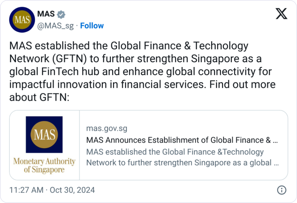 The Monetary Authority of Singapore (MAS) founded the Global Finance and Technology Network (GFTN) as part of its ongoing efforts to establish Singapore as a global hub for financial technology innovation.