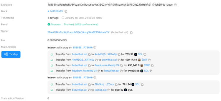 According to Solscan data, the maximum extractable value (MEV) bot, which was operated by 2fast, exchanged 703 Solana for 490,000 WIF and then the same quantity of WIF for 19,035 SOL within the same transaction bundle, generating a $1.73 million profit.