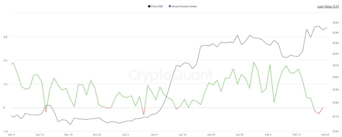 CryptoQuant, a supplier of blockchain analytics, reports that between February 17 and February 19, the Korea Premium index fluctuated within a range of -0.24 and 0.01 points.