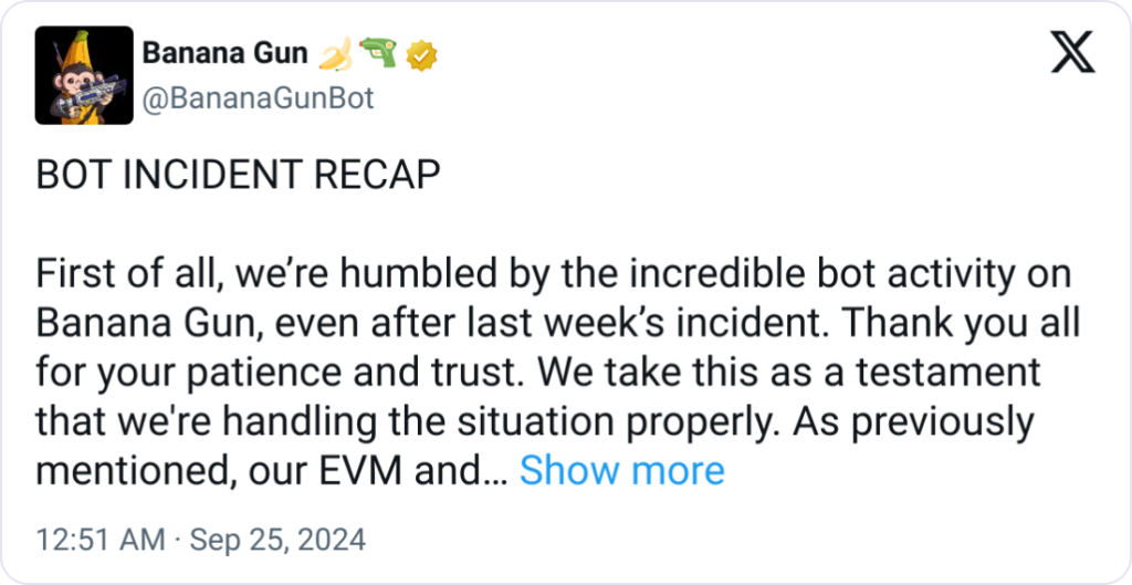 The breach on Banana Gun reported on September 19 forced the company to suspend its Ethereum Virtual Machine (EVM) and Solana bots.