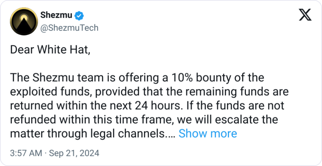 When Shezmu discovered a compromise in one of its ShezmuUSD (ShezUSD) stablecoin vaults, the hacker requested the return of ninety percent of the stolen funds via an onchain message within twenty-four hours.