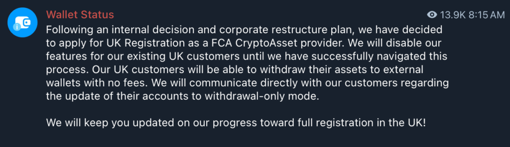 In the meantime, UK users can withdraw funds to external wallets without fees, and Telegram will keep customers updated regarding their accounts.