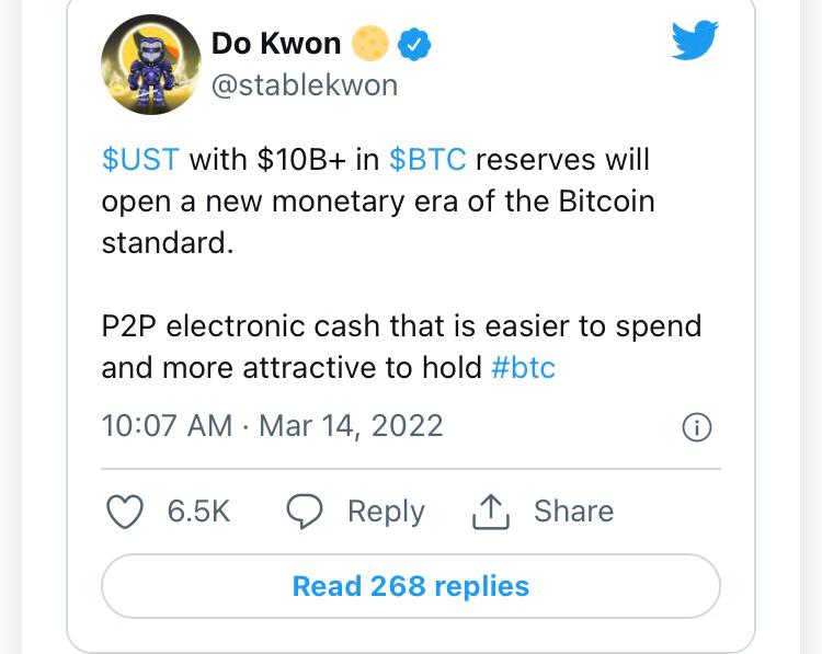 Kwon further stressed that TerraUSD (UST), which is backed by $10 billion in BTC reserves, will “start a new monetary era of the Bitcoin standard.”