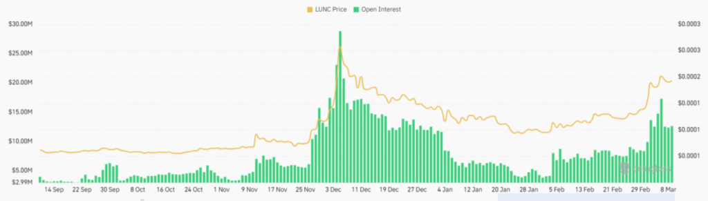 Open interest in LUNC futures has decreased in leading derivative exchanges, but 1000LUNC OI on Binance continues to support the upside movement.
