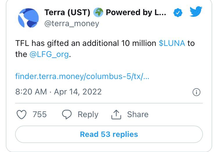 Terraform Labs' most recent announcement, made via Twitter on April 14, did not specify what the funds would be used for. However, Terra Finder transaction data indicates that 7.8 million LUNA (approximately $630 million) were quickly transferred out of the LFG's reserve wallet yesterday.
