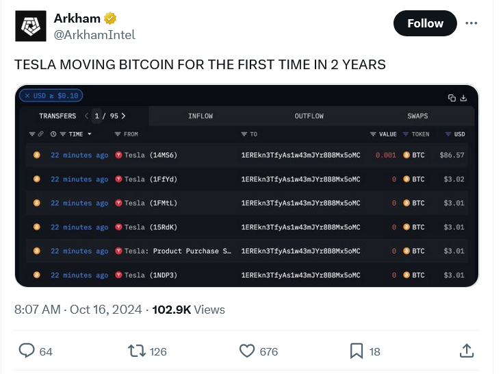 According to information provided by Arkham Intelligence, cryptocurrency wallets that were identified as belonging to Tesla were responsible for the transfer of 11,500 Bitcoin on October 15 across a total of 26 transactions, which included test transfers.