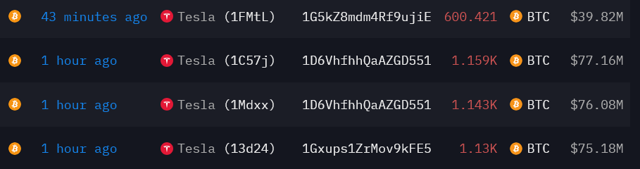 Tesla transfers $765M Bitcoin to unknown wallets
