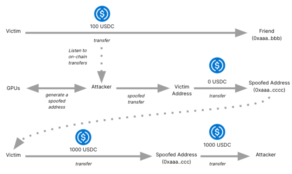 For example, if the victim sent 100 coins to an address for an exchange deposit, the attacker could transmit 0 coins from the victim's wallet to a similar-looking address under their control.