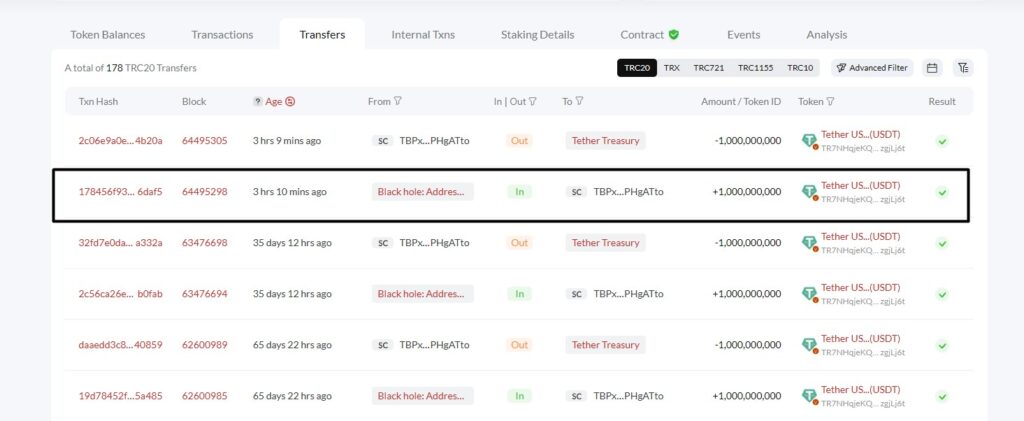 On August 20, blockchain data revealed that Tether had issued one billion dollars worth of Tether tokens on the Tron network and then transferred them to its Treasury wallet.