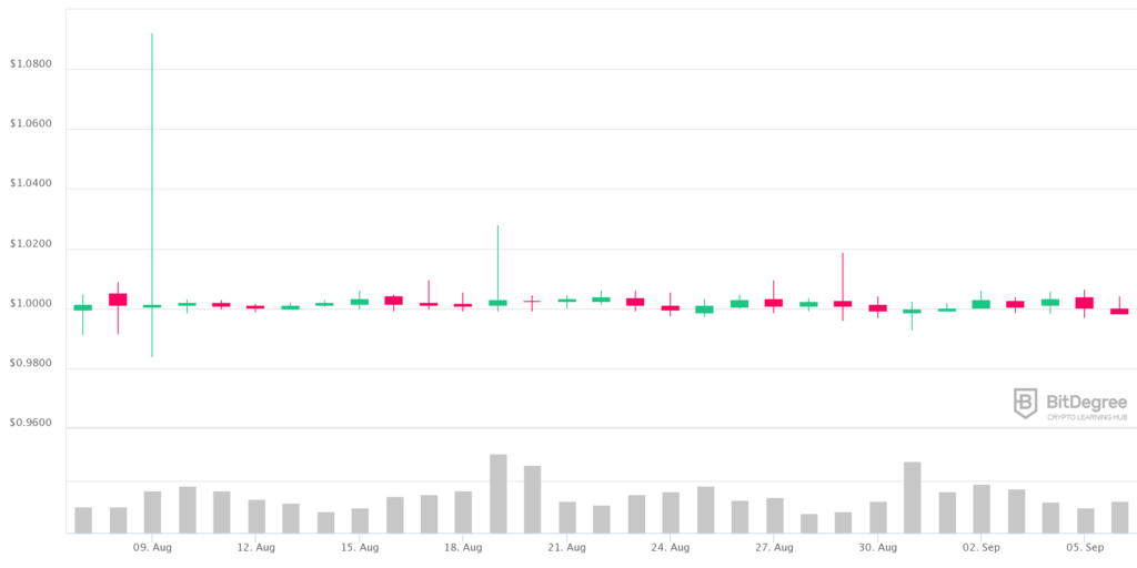 Candlestick chart of USDT price on Aug. 17, 2023 | Source