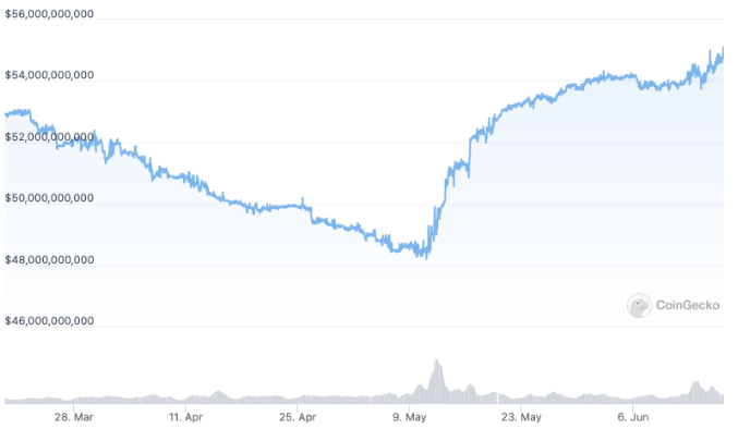 While Tether has been losing market share in recent weeks, alternative stablecoins, such as the USD Coin (USDC), have been increasing in value. As a result, the market capitalization of USDC increased from around $48 billion in mid-May to $55 billion in mid-June.