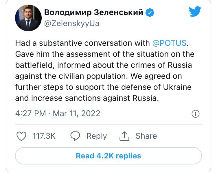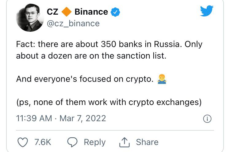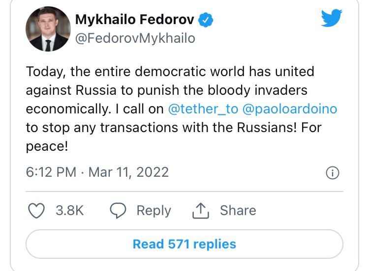 Russia's and Ukraine's relationship is still evolving. While Ukraine has been under Russian missile attacks since February 24, Ukraine's minister of digital transformation, Mykhailo Fedorov, continues to issue tweets urging financial services firms, especially those involved in crypto, and significant corporations to stop doing business with Russia: