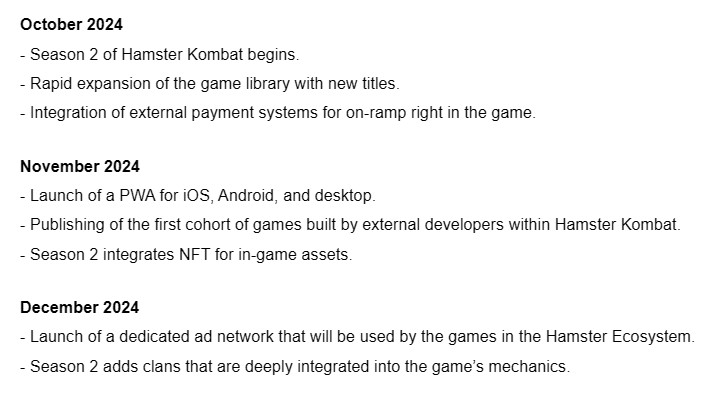 The Hamster Kombat team presented a revised roadmap on September 25. The roadmap outlined the team's objectives for the final quarter of 2024 and 2025.