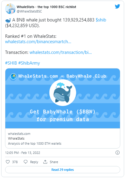 On February 13, a BNB whale rated 1 by this data service purchased approximately 140 billion Shiba Inu tokens, according to analytics released by the @WhaleStatsBSC Twitter account, which gives data on the top 1,000 rich list of Binance Smart Chain (BSC) whales.
