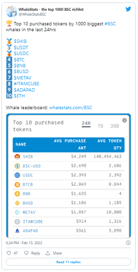 In another tweet, @WhaleStatsBSC released a list of the top 10 most purchased cryptocurrencies in the last 24 hours by the top 1,000 Binance Smart Chain (BSC) whales.