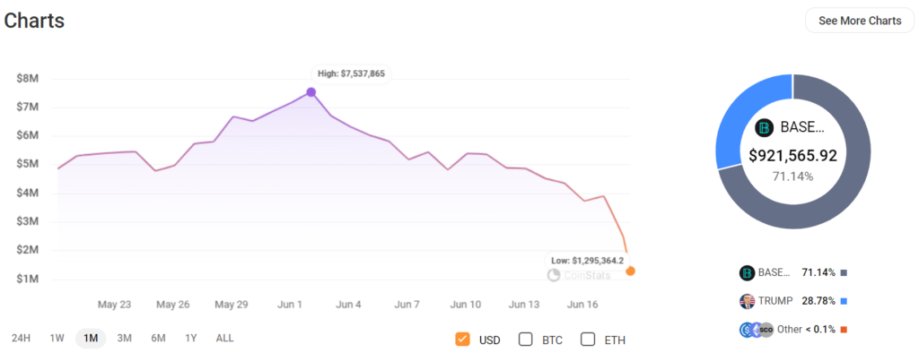 The shrewd whale's wallet still contains 28% Trump tokens, which are valued at $372,000. His most valuable asset is the BasedAI (BASEDAI) coin, which accounts for over 71% of his portfolio and is valued at $921,000.