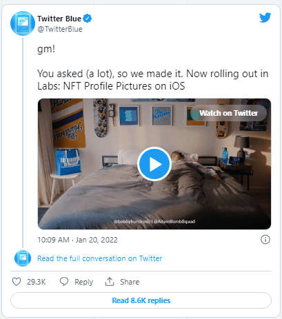 According to a Twitter spokesman, the firm is restricting the distribution to Blue customers for the time being in order to gather feedback on the NFT functionality and make necessary adjustments.