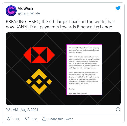 HSBC UK reportedly banned credit card payments to Binance, according to a number of claimed HSBC clients who reported it on Twitter on Monday.