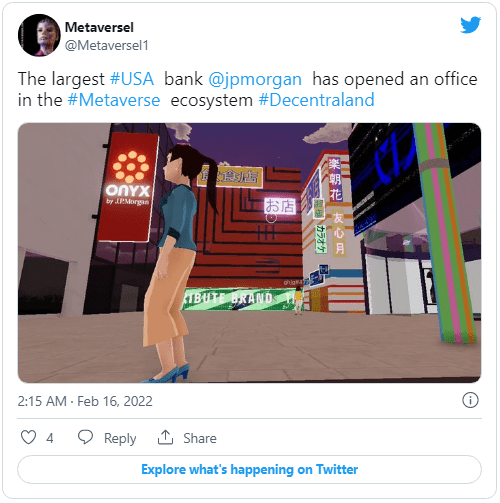 US banking giant JP Morgan has opened an office in Decentraland, following the bank's entrance into the metaverse with the launch of a virtual lounge, the price of the virtual reality game's native token (MANA) has seen an increase of about 10%.