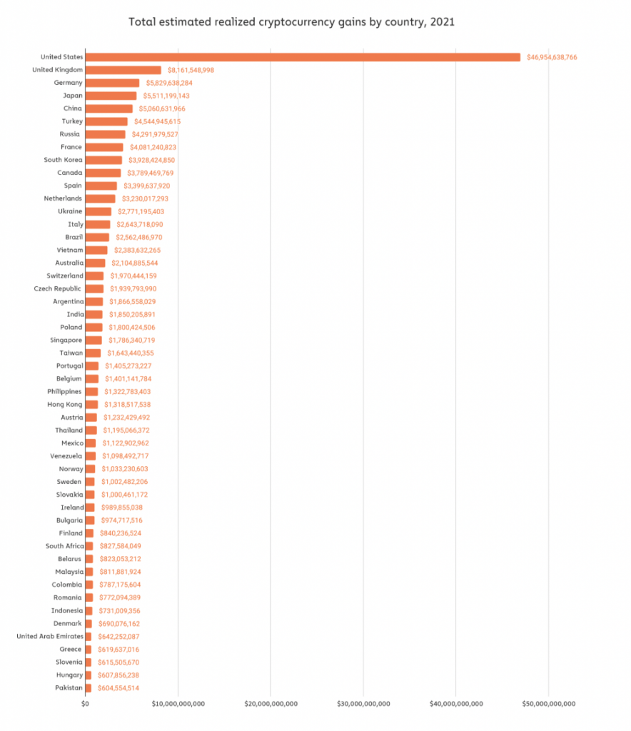 The report comes at a time when global cryptocurrency adoption is gaining traction. The United States saw a massive increase in adoption and realized gains, with total estimated gains for 2021 increasing 476 percent from $8.1 billion the previous year.