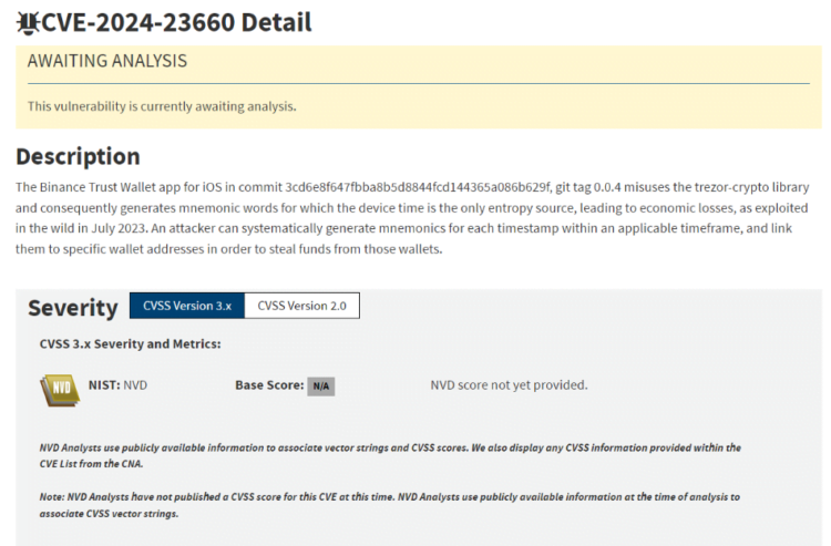 After many Ether wallets were compromised, Secbit Labs reportedly investigated the Binance Trust Wallet app for iOS, as reported by CVE, a program sponsored by the U.S. Department of Homeland Security.