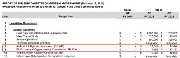 An annual combined fund allocation of $39,240 has been proposed by the Virginia Senate committee for two recently established commissions on cryptocurrency and artificial intelligence (AI).