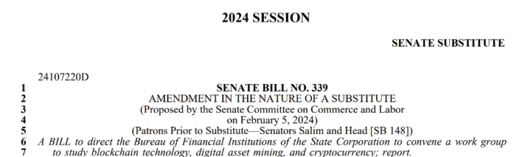Legislators in Virginia introduced Senate Bill No. 339 on February 5 to solicit recommendations regarding promoting and expanding blockchain technology, digital asset mining, and cryptocurrencies in the state.