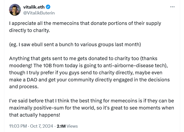 Buterin announced in an X post on October 7 that he would donate all 10 billion memecoin tokens he had received to an organization specializing in anti-airborne-disease technology.