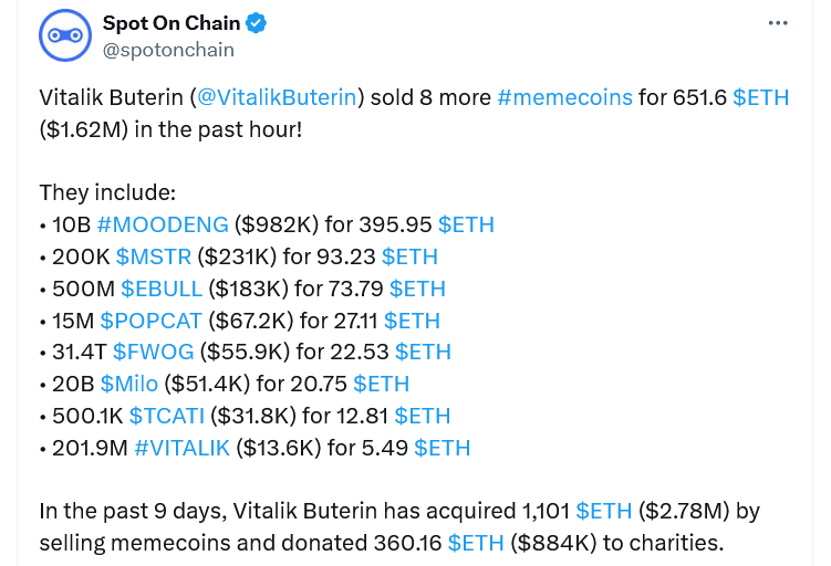 Vitalik Buterin Sells $1.6M in Memecoins Pledged for Charity