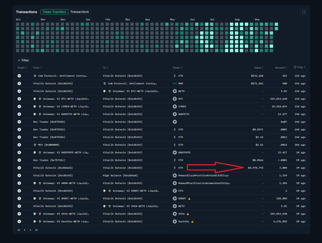 Blockchain sleuths have identified several Ether transactions. In September 2023, transactions from a wallet associated with Ethereum co-founder Vitalik Buterin totaled over $3.9 million.
