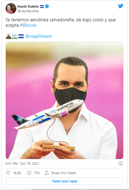 Salvadoran President Nayib Bukele announced the airline's acceptance of Bitcoin on Twitter.